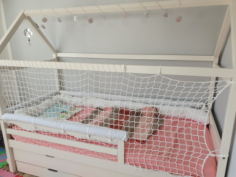 We use the net to secure our daughter's bed. We have attached it so that it can be folded up during the day and folded down and secured when she goes to sleep. We are very happy with the net and the service. I ordered the smaller net after ordering it in writing and it was added to the first order without any problems and without any additional shipping costs. I can definitely recommend the nets. translated, original text: "Wir nutzen das Netz, um das Bett unsere Tochter abzusichern. Wir haben es so befestigt, dass man es tagsüber hochklappen und nach dem Einschlafen runterklappen und festmachen kann. Wir sind sehr zufrieden mit dem Netz und dem Service. Das kleinere Netz hatte ich nach der Bestellung und schriftlich nachgeordert und es wurde problemlos ohne weitere Versandkosten zur ersten Bestellung hinzufügt. Ich kann die Netze klar weiterempfehlen."
