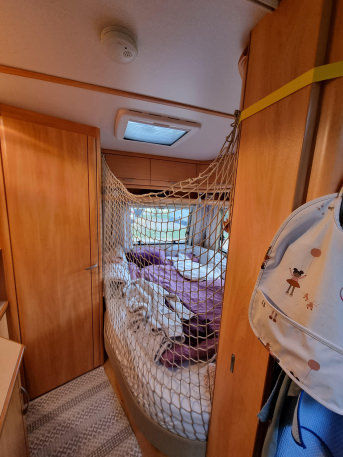 We were able to use the safety nets very easily and effectively in our motorhome. Our children, both under three, like to sleep or play in the higher compartments of the motorhome. The bunk beds only have a small entrance, which we also secured with small nets. We secured the alcove, in the picture, with a 1.40 m long net - absolutely reliable! Simply hang it on a rope with a snap hook and you're done. translated, original text: "Wir konnten die schutznetze sehr einfach und effektiv in unserem wohnmobil einsetzen. Unsere Kinder, beide unter drei, schlafen oder spielen gerne in den höheren abteilen des wohnmobils. Die hochbett en haben nur einen kleinen Zugang, den wir ebenfalls mit kleinen Netzen gesichert haben. Den Alkoven, im Bild, haben wir mit einem 1,40 langen Netz gesichert-absolut vertrauenswürdig! Einfach mit Karabinerhaken an eine Öse gehängt und fertig."