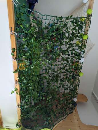 We are also very happy with the color of the safety net. It fits perfectly into the overall look of our room and gives it an attractive appearance. With the ivy tendrils threaded through it, it is also a cozy cave on the inside. The safety net is not only functional, it also looks great.
