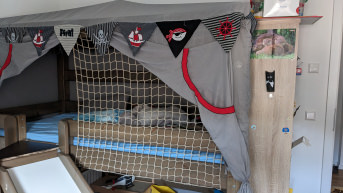 Our son wanted a pirate ship. He got a little brother and so we had to make his bed bigger. Since we were afraid that he might fall down because he is only 3 years old, we looked for a simple and inexpensive solution. While searching on the Internet we came across Safetynet365. Thanks to you, our son now has a custom-made pirate ship where he can sleep safely. translated, original text: "Unser Sohn hat sich ein Piratenschiff gewünscht. Er hat einen kleinen Bruder gekriegt und deswegen haben wir sein Bett aufstocken müssen. Da wir die Angst hätten, dass er runter fallen könnte weil er erst 3 Jahre alt ist, haben wir nach eine einfache und günstige Lösung gesucht. Beim suchen im Internet sind wir auf Schutznetze 24 gestoßen. Dank Ihnen hat unser Sohn jetzt ein Piratenschiff nach Maß, wo er sicher schlafen kann."