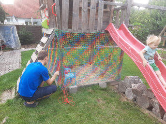 The delivery was also much earlier than announced, so the children were able to move into the now beloved tree house even earlier. translated, original text: "Wir haben für die Kinder ein Bett mit Baumhaus entworfen und gebaut. Als Fallschutz war eigentlich ein Holzzaun vorgesehen, aber dann sind wir auf ihr Produkt gestoßen und haben uns - zum Glück- für ein Fangnetz Ihrer Firma entschieden. So können die Kleinen wachsen und sind auch noch in ein paar Jahren sicher geschützt, da das Netz bis zur Decke reicht.