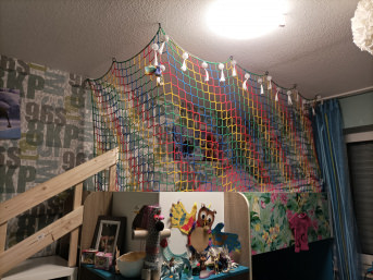 We put climbing ropes through the net and made a climbing tunnel for our little ones that goes back and forth between their beds. These are the squirrel tree and the pirate's nest. And in between there is the tunnel ;). It's a lot of work to hang the thing up properly, but it's more than worth the effort. And lots of fun for the little ones translated, original text: "Wir haben das Netz mit Kletterseilen durchzogen und unseren Kleinen einen Klettertunnel damit gemacht, der zwischen Ihren Betten hin und her führt. Das sind nun der Eichhörnchenbaum und das Piratennest. Und dazwischen der Tunnel eben ;). Viel Arbeit das Ding richtig aufzuhängen, aber die Mühe mehr als wert. Und viel Spass für die Kleinen"