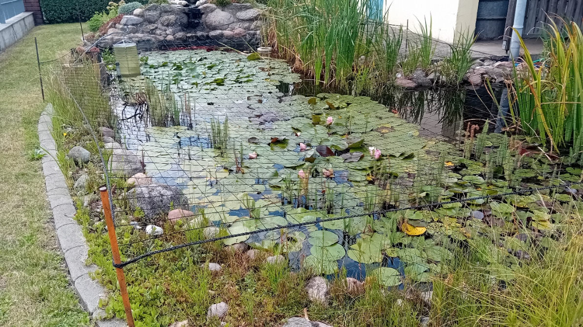 We are very happy with the net and hope that it will last a few years. translated, original text: "Das Schutznetz haben wir im Mai über unseren (Mini-)Teich gespannt.