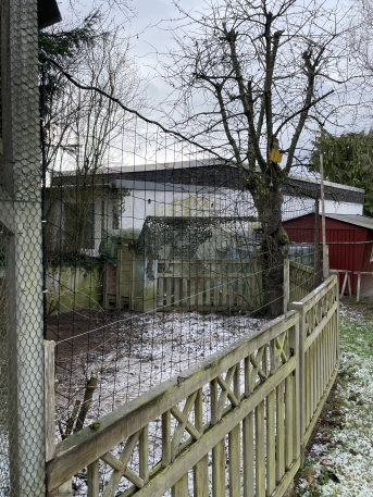 The net is used as a bird protection net so that the chickens don't fly over the fence and no birds of prey come in from above.