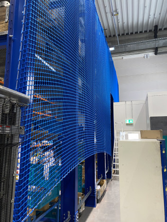 Custom-made safety net for vertical fuse of pallet racks. The net is used in racking systems to protect goods from falling out of the rack or to protect people on traffic routes from falling objects.