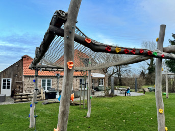 A net on a climbing frame for children. The net was attached with a rope so that the children don't get hurt. The children love it and don't want to get down ;-) translated, original text: "Liegenetz auf einem Klettergerüst für Kinder. Damit sich die Kinder nicht verletzten wurde das Netz mit einem Seil montiert. Die Kinder lieben es und wollen garnicht mehr runter ;-)"