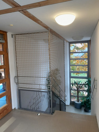 We have two small children who love gymnastics and get up to a lot of mischief. Since we have a 40cm gap between our handrail and our staircase, through which our children would fall one floor if they climbed over the handrail, we decided to install a safety net to prevent a complete, uncontrolled fall in an emergency. The safety net now gives us peace of mind, as we can't keep an eye on our children every second.