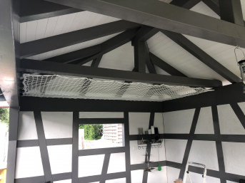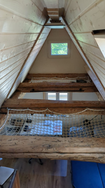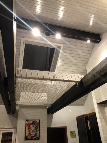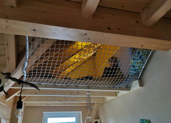 My safety net serves as a kind of hammock in the attic of my open roof structure. It was relatively easy to hang up for the installation area.