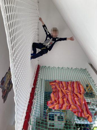The safety net is installed in our son's room - so that he doesn't fall off the "loft bed"...... very cool thing translated, original text: "Das Schutznetz ist im Kinderzimmer unseres Sohnes angebracht- damit er nicht vom "Hochbett" fällt...... sehr cooles Teil"