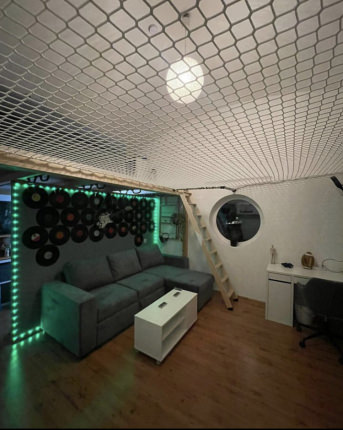 Net stretched from wall to wall in the children's room and used as a hammock or to lie on. The net is great in terms of quality and price. translated, original text: "Netz im Kinderzimmer von Wand zu Wand gespannt und dient als Hängematte oder zum drauf liegen. Da netz ist super von der Qualität und Preis."