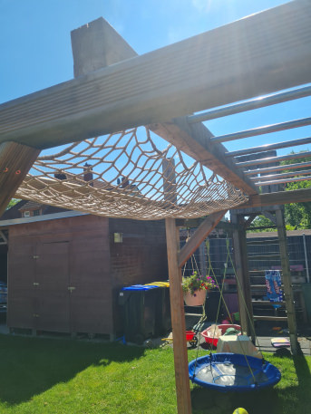 Ich hatte vor rund einem Jahr ein Schutznetz nach Maß gekauft. Das Netz wurde nicht für den ursprünglich gedachten Einsatz gekauft sondern - als Sicherungsnetz für einen Kletterpakur, den ich für meine Kids in den Garten gebaut habe.