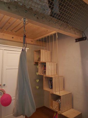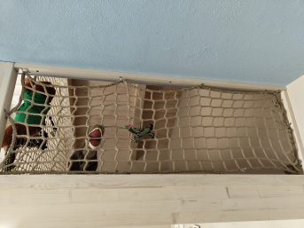 The grandchildren can now play there carefree without having to worry about the children falling. translated, original text: "Ich habe mit den drei Netzen die Galerien in den Kinderzimmern abgesichert.