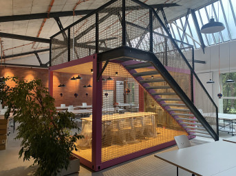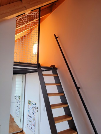 Open stairs: the distance between the steps is greater than 12cm --> therefore a net is placed on the underside of the stairs to prevent a small child from falling.