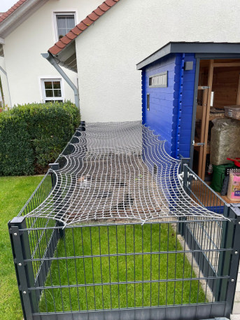 We ordered two nets to protect our rabbits (from martens, wolves and birds of prey). The nets are attached to the fence with snap hooks. The dimensions are perfect - even if they seem smaller when unpacked and unfolded. Since the nets can be stretched slightly, they hang nicely and tautly over the fence.