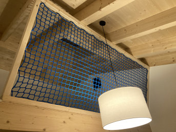 The custom-made nets serve as protection and a lying area in the children's room. translated, original text: "Die auf Maß angefertigten Netze dienen als Schutz und Liegefläche im Kinderzimmer."