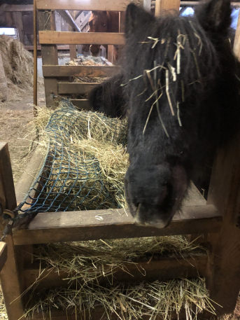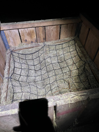 The net is intended to cover the hay rack so that the horses don't throw the hay out of the rack and to extend the feeding time. The mesh size of 10 x 10 cm is just right for this, the horses can pull the hay out but can't throw it out.