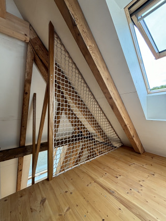 Due to our positive experience, we will contact the company again if we need anything else: We are very satisfied with the quality of the nets and the price is reasonable. The production and delivery time of around 3 weeks has not been an issue for our projects so far, as the need was not particularly urgent and therefore fit easily into our planning. translated, original text: "Die beiden dreickeckigen Netze verhinden Stürze vom umgebauten Dachzimmer und sehen dabei gut aus.