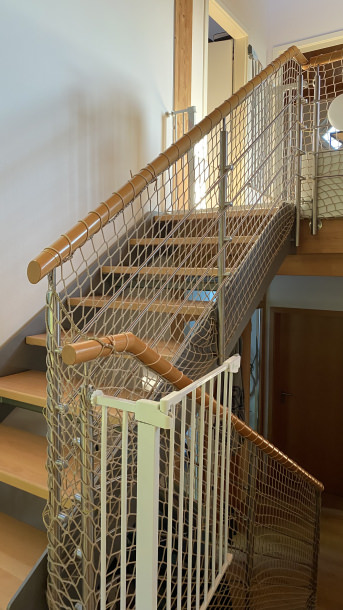 As a protection against children falling down stairs. I can only recommend the nets. Excellent workmanship and perfect fit. Always happy to use. translated, original text: "Als Treppenabsturzschutz für Kinder. Die Netze kann ich nur empfehlen. Super Verarbeitung und passgenauigkeit. Immer wieder gerne."
