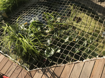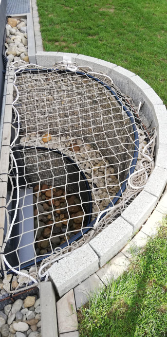We needed the safety net for our pond. We were looking for a solution that was suitable for us, particularly for safety reasons, as child protection for our 11/2 year old granddaughter. We put ground anchors on the sides and stretched them to the wooden deck with dowels. We think it fits harmoniously into the overall picture and the water lilies find their way through the net. translated, original text: "Wir haben das Schutznetz für unseren Teich gebraucht. Wir haben nach einer, für uns passenden Lösung, aus Sicherheit insbesondere als Kinderschutz für unsere 11/2 jährige Enkelin gesucht. An den Seiten haben wir Erdanker gesetzt und zum Holzdeck mit Dübeln gespannt. Wir finden es passt harmonisch ins Gesamtbild und die Seerosen finden ihren Weg durch das Netz."
