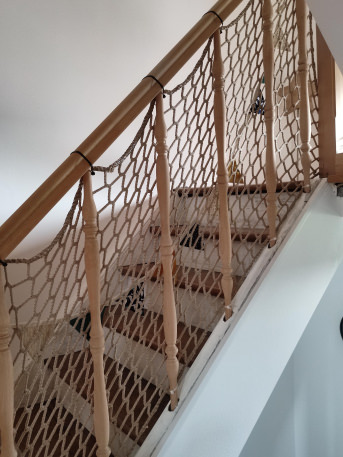 Hello, we used the stairwell safety nets that we ordered to secure our stairwell. Our little dog is now protected from falling into the cellar thanks to the precise fit of the nets. All in all, we are very satisfied because we now have a good feeling that nothing can happen. In addition, the white color of the net on the banister means that it is hardly noticeable. To secure the steps, we stretched a beige net underneath the steps. This also matches the color of the beechwood steps quite well. I can definitely recommend the nets because the quality and fit are very good. translated, original text: "Hallo, die bestellten Treppenhaus Sicherungsnetze haben wir zur Absicherung unseres Treppenhauses verwendet. Unser kleiner Hund ist somit durch die passgenaue Anfertigung der Netze vor einem Sturz in den Keller gesichert. Alles in allem sind wir sehr zufrieden, da wir nun ein gutes Gefühl haben, das nichts passieren kann. Ausserdem ist das Netz durch die weisse Farbe am Treppengeländer kaum auffällig. Für die Absicherung der Treppenstufen, haben wir ein Beiges Netz unterhalb der Stufen gespannt. Auch dieses passt sich den Buchenholzstufen farblich recht gut an. Ich kann die Netze auf jeden Fall weiterempfehlen, da die Qualität und Passgenauigkeit sehr gut sind."