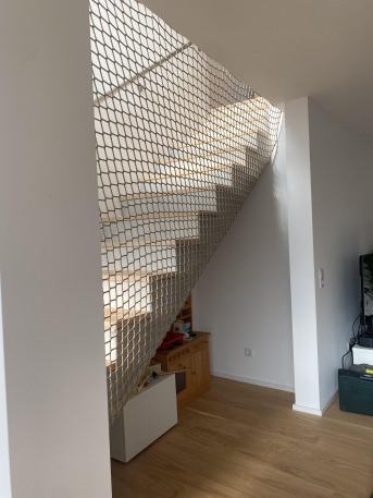 The hemp-colored safety net makes our stairs fall-proof. The net fits perfectly, is well made and gives a feeling of security. The stair design remains light and airy. Highly recommended. translated, original text: "Das hanffarbene Sicherheitsnetz macht unsere Treppe absturzsicher. Das Netz passt genau, ist gut verarbeitet und gibt ein sicheres Gefühl. Das Treppendesign bleibt hell und luftig. Sehr empfehlenswert."