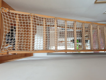 After renovating the hallway, including the banister, the latter should not be drilled into again. Therefore, an alternative to the existing boards as fall protection was needed. I chose the safety net, which could now also be decorated (fairy lights, etc.). translated, original text: "Nach der Renovierung des Flures inklusive des Treppengeländers sollte letzteres nicht wieder angebohrt werden . Darum mußte eine Alternative zu den bisherigen Brettern als Fallschutz her . Meine Wahl fiel auf das Sicherungsnetz , das man jetzt auch noch dekorieren könnte (Lichterkette etc.) ."